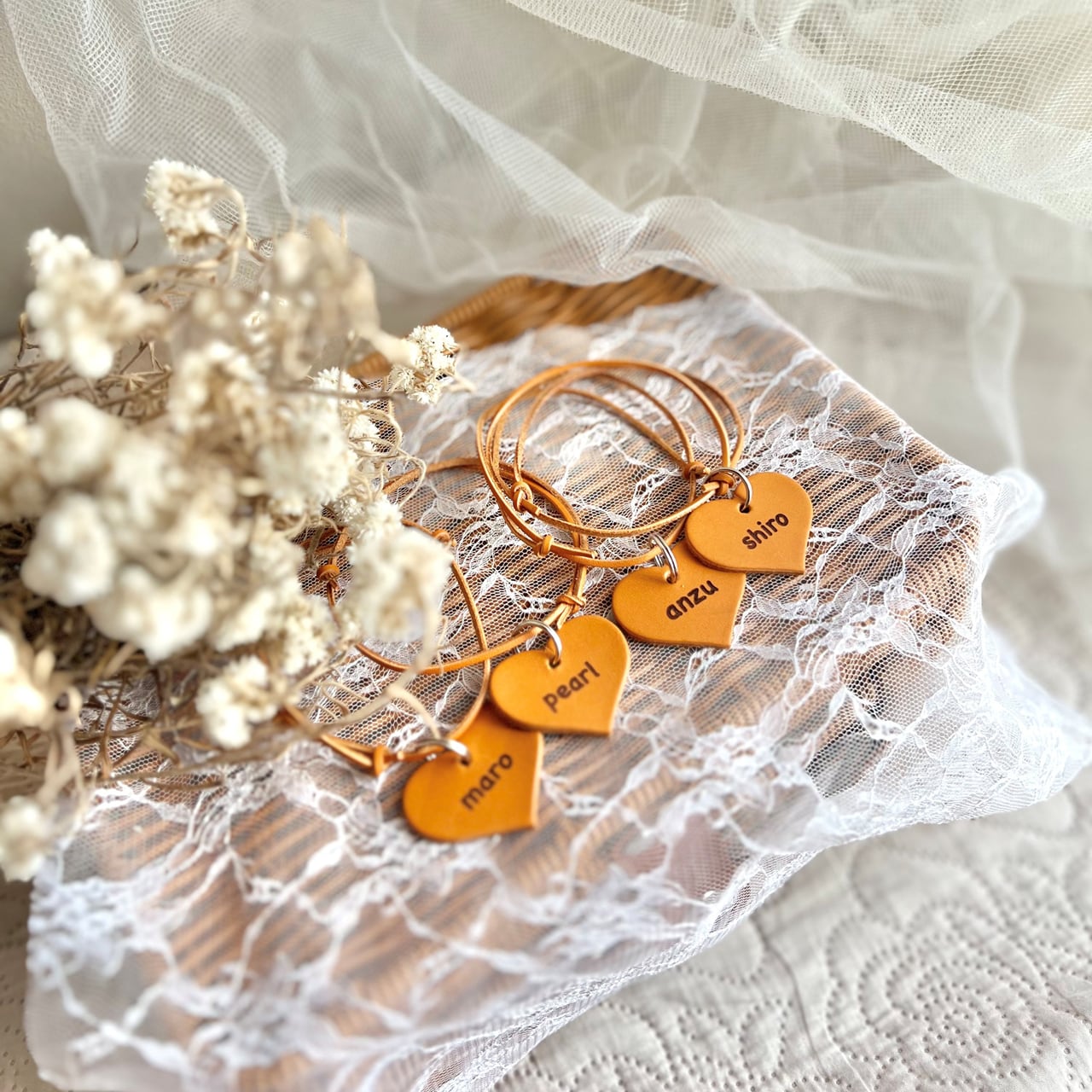 愛犬を愛らしく演出する、革製のハートチョーカーです。お名前を入れることで、特別感が増し、愛犬との絆をさらに深めるアイテムになります!