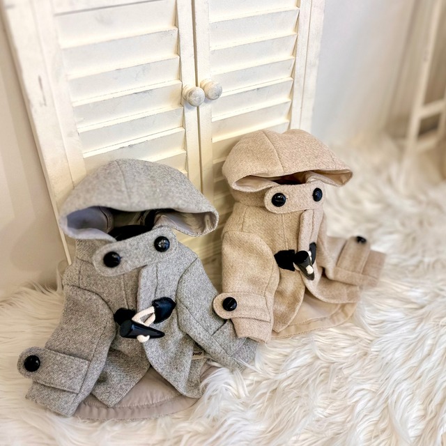 ダッフルコート 犬服 愛犬をおしゃれに演出するダッフルコートです。 もちろん、寒い季節のお出かけにもぴったり! 温かく、柔らかい素材を使用しているため 愛犬も快適に過ごせます。 ◇カラー紹介 【グレー】 落ち着いたトーンのグレーは、洗練された都会的な印象です。 どんな毛色のワンちゃんにも合わせやすく、クールで上品なスタイルを演出してくれます。 シックなお散歩コーデにぴったりです。 【ベージュ】 温かみのあるベージュは、柔らかくナチュラルな雰囲気を引き立てます。 優しい色合いがワンちゃんの愛らしさを際立たせ、お散歩中も注目を集めること間違いなしですね! ◇サイズ展開 SからXLまで豊富なサイズをご用意しています Sサイズ 胴回り約33cm・着丈約23cm・袖口回り約11cm・袖の長さ約8cm Mサイズ 胴回り約37cm・着丈約24.5cm・袖口回り約12cm・袖の長さ約9.5cm Lサイズ 胴回り約42cm・着丈約26.5cm・袖口回り約13cm・袖の長さ約11cm XLサイズ 胴回り約47cm・着丈約29cm・袖口回り約14cm・袖の長さ約12cm このコートは各サイズ数量限定でご用意しています。 特別なデザインだからこそ、大切なワンちゃんにぜひ着てほしい一着です。 大人気のコートですので、気になった方はお早めにご検討いただければ幸いです。 LeaLikoオリジナルGIFTBOX(1000円)に入れてお届けいたします お洗濯は手洗いで、いつでも清潔な状態を保つことができます。 お届けまでに3〜4日いただく場合がございますが、ご了承くださいませ。 ご不明な点やご相談がございましたら、お気軽にお問い合わせくださいませ!